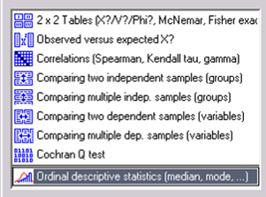 Рис. 4—Список инструментов анализа с пиктограммами в модуле непараметрических методов. При интерпретации результатов при отсутствии достоверных различий ошибочным является заключение об их отсутствии, и может быть принято только заключение о том, что различия именно не были выявлены, хотя могут и присутствовать (характерно для выборок малой численности). С другой стороны, особенно на больших выборках могут быть выявлены различия, не имеющие биологического или медицинского значения. И наоборот, даже существенное различие, выявленное при сравнении небольших групп, имеющее клиническое значение, но не быть при этом статистически значимым. Если в ходе исследования, включающего несколько больных в терминальном состоянии, хотя бы один из участников в какой-либо из групп выживет, такой результат будет клинически значимым, хотя статистически значимое различие в частоте выживания между группами может отсутствовать [11]. При проведении анализа данных часто возникает так называемая проблема множественных сравнений (ПМС), заключающаяся в следующем: чем больше статистических гипотез проверяется на одних и тех же данных, тем более вероятна ошибка первого рода — заключение о наличии различий между группами, в то время как на самом деле верна нулевая гипотеза об отсутствии различий. Так, если за уровень значимости принято значение р=0,05, то 5 из 100 вычисленных значений р в силу случайности (по теории вероятности) окажется меньше 0,05 (хотя на самом деле верна нулевая гипотеза об отсутствии различий). На практике принято считать, что учет ПМС следует начинать в тех случаях, когда число рассчитываемых значениий более 10). В STATISTICA для уменьшения влияния множественных сравнений можно установить р на уровне 0,01 или 0,001 вместо 0,05. Считается, что такая поправка в достаточной мере компенсирует множественные парные сравнения, когда таковых избежать не удается: 1. При вторичном анализе данных. 2. При множественных парных сравнениях групп и подгрупп (по демографическим и клиническим характеристикам, исходам, временным точкам и т.д.). 3. При установлении эквивалентности групп в начале нерандомизированного исследования вмешательства. 4. При промежуточном анализе данных, полученных в испытаниях тех или иных вмешательств [7]. Анализ времени жизни в ППО STATISTICAДанные времени жизни имеют две характерные особенности, которые предопределяют специфику их анализа. Прежде всего возможна неполнота данных. Например, в клинических исследовании больные по тем или иным причинам «уходят» из-под наблюдения, часть лабораторных животных может регулярно забиваться для проведения анализов. Реальное же время жизни таких объектов больше длительности наблюдения за ними. Описанный феномен называется цензурированием справа. Наличие цензурированных данных затрудняет оценку эффекта изучаемого воздействия на время жизни, особенно при характеристике отдаленных результатов лечения. Другая особенность данных времени жизни - неадекватность распределения времени жизни статистической модели нормального закона распределения. Конкретный же вид распределения, как правило, неизвестен. Поэтому аппроксимация распределения времени жизни нормальному закону, явная или неявная (при использовании параметрических методов анализа), представляет угрозу для корректности статистическ