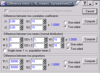Рис.5—Диалоговое окно в анализе исхода Каплана-Майера. Как показано на рисунке 5, ППО STATISTICA запрашивает данные о цензурированности (необходим индикатор, указывающий на значение времени (даты) исхода). Сравнение коэффициентов корреляцииИногда исследователи сталкиваются с проблемой сравнения нескольких коэффициентов корреляции. Так, иногда различия между двумя коэффициентами кажутся очевидными, но при этом не являются статистически значимыми, что в первую очередь может быть обусловлено различием в численности выборок [6]. ППО STATISTICA позволяет автоматически сравнить 2 коэффициента корреляции в Difference test (рис. 6). Достаточными данными являются сами коэффициенты корреляции и численности групп.