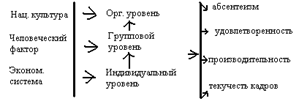 ОП представляет собой 3-х уровневую модель, в которой каждый последующий уровень базируется на предыдущем. Человек, приходя в орг-ю имеет свои черты характера и устоявшиеся модели поведения. Он становится членом группы, которая представляется ему с одной стороны свободой и развивает его способности, а с другой – накладывает на человека ограничения. То же касается и орг-ии в целом. 1. Эконом. система: Человеческий капитал: 1) проф. подготовка и квалификация 2) трудовой опыт и традиции 3) общая культура и культура труда 4) соц.-псих. качества человека 5) здоровье и работоспособность Наиболее эффективными сферами вложения в человеческий капитал в разных странах считают: 1) здравоохранение и соц. обеспечение 2) образование 3) трудовая миграция 2. Национальная культура Учет культурных различий необходим. Т.к организационное поведение в различных культурах имеет отличие, которое определяет многообразие отношений и элементов. Можно выделить 5 основных характеристик: 1. Взаимосвязь с окр. средой · люди зависимы от окр. среды · люди живут в гармонии с окр. средой · люди господствуют над окр. средой 2. Временная ориентация · ориентация на прошлое · ориентация на настоящее · ориентация на будущее 3. Природа людей · люди добрые · люди не добрые · люди м/б как добрыми, так и не добрыми 4. Ориентация деятельности · действие · существование · контролирование 5. Направленность ответственности · индивидуалисты · группа · иерархия 6. Пространственная ориентация · уединенность · открытость · смешанный характер 6. ВЫХОДЯЩИЕ ХАРАКТЕРИСТИКИ ОП 1) производительность включает в себя продуктивность и эффективность. Предприятия работают продуктивно, если продукция пользуется спросом и доля его на рынке высока. Однако производительность будет зависеть от эффективности достижения предприятием своих целей (прибыль, выработка в ед. времени). 2) абсентеизм (отсутствующий) Пр.: конвеер. Уровень абсентеизма, превышающий допускаемый влияет на эффективность и на продуктивность работы на предприятии с усложнением технологических процессов и введением более сложного оборудования 3) текучесть кадров (затраты на отбор персонала, но на вакантное место могут прийти более подготовленные кадры) 4) удовлетворенность Для измерения уровня удовлетворенности можно воспользоваться двумя подходами: 1. метод единой оценки: Полностью не удовлетворен _______________________ Полностью удовлетворен 2. суммирование оценок удовлетворенности различными сторонами работы: · самореализация в работе · характер контроля · справедливое вознаграждение · условия труда · соответствие работы типу личности · психологический климат Выходные элементы ОП дают реальную возможность проводить анализ эффективности внедрения многих мероприятий по совершенствованию работы с персоналом и изменениям работы внутри организации. 7. ОСОБЕННОСТИ ОБМЕНА ИНФОРМАЦИЕЙ В КОММУНИКАЦИОННОМ ПРОЦЕССЕ Процесс коммуникации представляет собой процесс обмена информацией. Именно потому, что обмен информацией встроен во все основные виды управленческой деятельности, мы называем коммуникации связующим процессом. А одним из важных инструментов управления в руках менеджера является находящаяся в его распоряжении информация. Используя и передавая эту информацию, а также получая обратные сигналы, он организует, руководит и мо