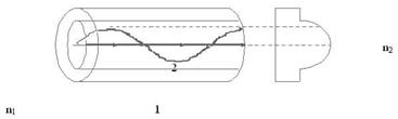 Рис. 2 Аксиальный луч (1) проходит меньший путь, но в среде с большим показателем преломления. Периферийный луч (2) проходит больший путь, но в среде с меньшим показателем преломления. В результате время пробега лучей выравнивается и расширение импульса