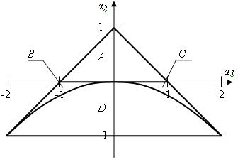На рис. 8, б) показан энергетический спектр процесса на выходе фильтра при a1 = 0,8; а на рис. 8, в) – при a1 = - 0,8. АР-фильтр второго порядка позволяет формировать коррелированные последовательности с более разнообразными корреляционными функциями. Его системная функция K(z-1) = Значения коэффициентов а1 и а2 ограничены областью устойчивости, которая показана на рис. 9 (коэффициенты должны находиться внутри треугольника).Область устойчивости делится на четыре подобласти в зависимости от вида полюсов: А – два действительных полюса разного знака; В – два действительных отрицательных полюса; С – два действительных положительных полюса; D – два комплексно сопряженных полюса. От расположения полюсов будет зависеть форма энергетического спектра и корреляционной функции генерируемого случайного процесса.