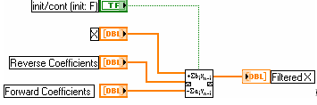 Рис. 10 Выходная последовательность (Filtered X) вычисляется по выражению y(n) = b0x(n) + b1x(n – 1) + … + bkx(n – k) – – (a1y(n – 1) + a2y(n – 2) + … + amy(n – m)). Системная функция фильтра: K(z-1) = Она отличается от записанной ранее системной функции АРСС-фильтра знаком коэффициентов ai (i ≥1).Коэффициенты числителя задаются в виде одномерного массива и подаются на терминал Forward Coefficients. Массив коэффициентов знаменателя подается на терминал Reverse Coefficients. Логическая переменная, подаваемая на вход init/cont (init: F) (инициировать/продолжить (иниц: F)) управляет инициализацией внутренних состояний фильтра. По умолчанию на входе установлено значение ЛОЖЬ. При этом внутренние состояния устанавливаются в 0. При установке на входе инициировать/продолжить значения ИСТИНА внутренние состояния соответствуют последним состояниям фильтра из предыдущего запуска ВП. При нулевых внутренних состояниях выходной процесс устанавливается в стационарное состояние спустя некоторое время после запуска ВП (время переходного процесса). Для устранения переходного процесса целесообразно установить логическую переменную в состояние ИСТИНА и обеспечить повторный запуск. Последняя генерируемая последовательность будет стационарной. Для многократного повторения моделирования целесообразно использовать структуру While Loop (Цикл по условию). Он эквивалентен выражению: do (программа) while (логическое условие). Цикл While похож на цикл For. Различие этих циклов в том, что число итераций в цикле For заранее определено и задается через терминал N числа итераций, а в цикле While – итерации продолжаются, пока не будет выполнено заданное условие.