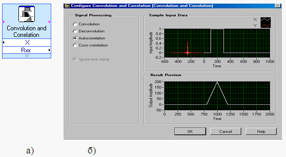 так как каждый из интегралов является интегралом от нечетной функции в симметричных пределах. Рассмотренная статистическая связь является нелинейной и никак не отражается в корреляционной функции. Корреляционная функция характеризует только линейную статистическую зависимость между отсчетами случайного процесса. Для измерения корреляционной функции в LabVIEW существует несколько виртуальных приборов. В данной работе используется экспресс-ВП Convolution and Correlation (Свертка и корреляция) (рис. 3 а), так как он представляет собой завершенную программу, не требует никаких дополнительных узлов управления и удобен в использовании. Панель конфигурирования экспресс-ВП Convolution and Correlation показана на рис. 3, б).