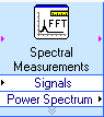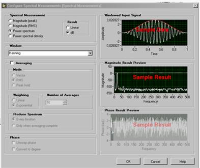 LabVIEW располагает разнообразными ВП для спектрального анализа (более 20 типов). Воспользуемся экспресс-ВП Spectral Measurements (Рис. 5), в котором предусмотрена возможность усреднения (Averaging) и оконной обработки (Window) для уменьшения краевых эффектов.