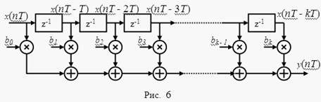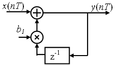 где m – порядок фильтра. Как следует из вида системной функции, выходной процесс авторегрессионного фильтра (АР-фильтра) связан с входным процессом рекуррентным соотношением y(nT) =b0x(nT) + a1y(nT – T) + a2 y(nT – 2T) + … + am y(nT – mT). Корреляционная функция определяется коэффициентами ai. Непосредственно по этому выражению нельзя найти корреляционную функцию, зная коэффициенты ai, как это было сделано по выражению (2). Для выявления качественного влияния коэффициентов на форму корреляционной функции воспользуемся ее связью с импульсной характеристикой фильтра. Рассмотрим сначала АР-фильтр первого порядка (рис. 7).