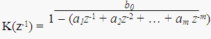 Изображенный фильтр описывается системной (передаточной) функцией K(z-1) = b0 + b1z-1 + b2z-2 + … + bkz-k. Передаточная функция в стандартной форме, полученная из системной функции умножением числителя и знаменателя на zk, имеет вид: K(z) = (b0zk + b1zk - ! + … + bk)/zk. Недостаток СС-фильтра: увеличение порядка фильтра с увеличением количества отсчетов корреляционной функции. Если корреляционная функция имеет бесконечную протяженность, то для сокращения порядка фильтра ее искусственно ограничивают по времени, пренебрегая малыми значениями корреляционной функции. Это приводит к возникновению методической ошибки моделирования. Авторегрессионный метод Существенная экономия машинных ресурсов и возможность моделирования случайных процессов с корреляционной функцией бесконечной протяженности достигается при использовании авторегрессионного метода. Авторегрессионный метод предполагает использование рекурсивных фильтров с системной функцией