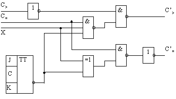 Курсовая работа: Дискретное устройство (ДУ)Курсовая работа: Дискретное устройство (ДУ)Содержание 1. Задание на курсовой проект 2. Введение 3. Проектирование дискретного устройства на элементах малой интеграции. 3.1. Проектирование блока триггера. 3.2. Проектирование микроопераций 3.2.1. Микрооперация установки триггера в " 0 ". 3.2.2 Микрооперация записи данных. 3.2.3. Микрооперация сдвига кода влево на один разряд. 3.2.4. Логическая микрооперация (“И”). 3.2.5. Микрооперация счета с параллельным переносом. 3.2.6. Микрооперация вычитание. 3.2.7. Микрооперация сравнения (>). 3.2.8. Микрооперация преобразования в дополнительный код. 3.2.9. Микрооперация свертки по модулю 2 (тип переноса последовательный (сквозной) ) 3.3. Построение объединенных функций возбуждения триггеров. 3.4. Расчет быстродействия ДУ. 4. Проектирование ДУ на БИС. 4.1. Проектирование схемы ДУ. 4.2. Карта программирования ПЗУ. 1. Задание на курсовой проект. Спроектировать дискретное устройство (ДУ) выполняющее следующие действия : * сброс элементов памяти * запись значения входного слова в ДУ * сдвиг кода в ДУ влево * логическая операция «&» (логическое “И”) * счетчик (-1) с параллельным переносом * арифметическая операция вычитание. * операция сравнения (>) * преобразование в дополнительный код * свертка по модулю 2 (тип переноса последовательный). Дискретное устройство проектируется на JK - триггерах Серия МИС 500, серия ПЗУ 1611 2. Введение. При синтезе проектируемое устройство представляется в виде структуры, представленной на рисунке 2.1