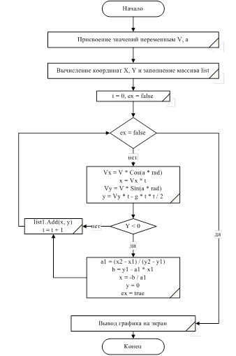 Программа показала идентичные результаты. Курсовой проект выполнен в среде MS Visual Studio 2008 с использованием языка высокого уровня Visual Basic. Разработка проекта проходила в несколько стадий, заключавшихся в изучении предметной области задачи; изучении основных законов механики; разработке самой программы, позволяющей моделировать движение тела, брошенного под углом к горизонту. Результатом проделанной работы стала программа, реализующая модель движения тела, брошенного под углом к горизонту. Программный продукт был протестирован в системах MS Windows XP, MS Windows 2003. В процессе тестирования ошибок выявлено не было. Практическая ценность программы была доказана при сопоставлении скорости выполнения расчетов вручную и с использованием разработанной программы. В течение разработки курсовой работы закреплены практические навыки программирования, полученные на лабораторных занятиях по дисциплине "Высокоуровневые методы информатики и программирования", углублены теоретические и практические знаний в области методологии программирования и разработки программных комплексов. Так же курсовая работа поспособствовала развитию навыков самостоятельного планирования и выполнения научно-исследовательской работы, получению опыта сбора и обработки исходного материала, анализа научно-технической литературы, справочников, стандартов и технической документации, приобретению навыков обоснования принимаемых проектных решений и профессионального оформления проектной документации. 1.В.В. Лабор «Visual Basic: создание приложений для Windows. Практическое пособие для новичков и профессионалов» Минск, «Харвест», 2003 г. 2.Ч. Петцольд «Программирование для Microsoft Windows на Basic, Пер. с англ. – М,: издательско-торговый дом «Русская Редакция», 2002 г. 3.Алешкевич В.А. Деденко Л.Г. Караваев В.А., «Механика», Академия 2004. Блок-схема