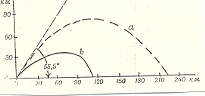 Рис. 1.1. Траектория движения артиллерийских снарядов Законы полета метательных снарядов не привлекали особого внимания ученых до тех пор, пока не были изобретены дальнобойные орудия, которые посылали снаряд через холмы или деревья - так, что стреляющий не видел их полета. Сверхдальняя стрельба из таких орудий на первых порах использовалась в основном для деморализации и устрашения противника, а точность стрельбы не играла вначале особенно важной роли. Близко к правильному решению о полете пушечных ядер подошел итальянский математик Тарталья, он сумел показать, что наибольшей дальности полета снарядов можно достичь при направлении выстрела под углом 45° к горизонту. В его книге "Новая наука" были сформулированы правила стрельбы, которыми артиллеристы руководствовались до середины ХVII века. Однако, полное решение проблем, связанных с движением тел брошенных горизонтально или под углом к горизонту, осуществил все тот же Галилей. В своих рассуждениях он исходил из двух основных идей: тела, движущиеся горизонтально и не подвергающиеся воздействию других сил будут сохранять свою скорость; появление внешних воздействий изменит скорость движущегося тела независимо от того, покоилось или двигалось оно до начала их действия. Галилей показал, что траектории снарядов, если пренебречь сопротивлением воздуха, представляют собой параболы.Галилей указывал, что при реальном движении снарядов, вследствие сопротивления воздуха, их траектория уже не будет напоминать параболу: нисходящая ветвь траектории будет идти несколько круче, чем расчетная кривая. Ньютон и другие ученые разрабатывали и совершенствовали новую теорию стрельбы, с учетом возросшего влияния на движение артиллерийских снарядов сил сопротивления воздуха. Появилась и новая наука – баллистика. Прошло много-много лет, и теперь снаряды движутся столь быстро, что даже простое сравнение вида траекторий их движения подтверждает возросшее влияние сопротивления воздуха. На рисунке 1.2 идеальная траектория движения тяжелого снаряда, вылетевшего из ствола пушки с большой начальной скоростью, показана пунктиром, а сплошной линией - действительная траектория полета снаряда при тех же условиях выстрела.