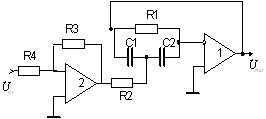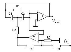 Рис. 1. Низкочувствительное звено полосового типа с симметричной RC-цепью Анализ схемы при идеальных операционных усилителях приводит к следующей передаточной функции: