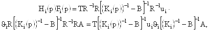 где Т – вектор-строка (1N), каждый элемент которого является коэффициентом передачи пассивной части схемы с выхода активного элемента к выходу схемы (y0); А – вектор-столбец (N1), каждый элемент которой является передачей пассивной части схемы с входа (Х0) ко входу активного элемента; ВТ– матрица (NN), каждый элемент которой представляет собой передачу пассивной части схемы с выхода i-го активного элемента ко входу j-го активного элемента; {K(p)} – диагональная матрица (NN), элементы которой являются передаточными функциями активных элементов; N – число активных элементов схемы; t0 – передаточная функция (сквозная передача) схемы при отсутствии активных элементов. Учитывая, что любая передаточная функция может быть представлена отношением двух полиномов