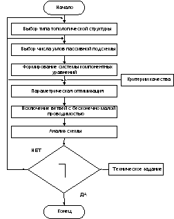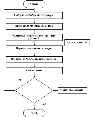 где S – чувствительность цепи;G – собственный шум схемы; D – динамический диапазон; I0 – потребляемый ток. Дерево инженерных решений может быть построено с помощью анализа существующего набора принципиальных схем. В рамках предлагаемого подхода формирование составляющих оператора осуществляется на базе арсенала инженерных приемов. Однако в этом случае практически исключаются изоморфные решения, следовательно, упрощаются вычислительные процедуры. 6. Автоматизированный синтез структурРазвитие рассмотренных выше методов синтеза структур регулярно проходило апробацию в процессе создания узкоспециализированных пакетов прикладных программ (подсистем) автоматизированного проектирования. Первая подсистема [2, 8] ориентировалась на метод компонентных уравнений при заданном типе топологической структуры и поэтому была ориентирована на синтез пассивных подсхем в RC- и RLC-базисе. В соответствии с алгоритмом (рис.5) для формирования системы компонентных уравнений необходимо задать топологическую структуру и число узлов схемы, которыми можно варьировать в процессе синтеза в зависимости от промежуточных результатов и опыта разработчика. Получение структуры осуществлялось модулем параметрической оптимизации, качество которого в силу многоэкстремальности целевой функции существенно влияет на конечный результат.