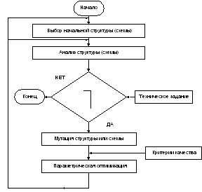 параметрической оптимизации основывался на методе Затем, сравнивая реализованные локальные экстремумы, выбирают наилучший и считают, что глобальный экстремум определен. Нетрудно видеть, что при таком подходе не может быть никакой уверенности в том, что найдено действительно наименьшее значение целевой функции и, следовательно, возможна потеря оптимальной схемы. Рассмотренная процедура обеспечивает хорошие результаты при «модернизации» (усовершенствовании) некоторого набора схемных решений. В этом случае этап выбора числа активных элементов исключается, а обобщенная структура заменяется на некоторое начальное приближение, дополняемое до уровня полного сигнального графа некоторыми ветвями или активными проводимостями. Такой подход был использован автором для получения универсальных фильтров четвертого порядка и позволил получить работоспособные принципиальные схемы. Параллельно с изложенными процедурами развивались применительно к синтезу цифровых схем генетические алгоритмы. Такое положение было связано с тем, что вершина дерева (42) для признаков качества цифровых схем характеризовалась хорошо отработанными схемотехническими приемами. Основная особенность генетического алгоритма состоит в том, что анализируется не одно решение, а некоторое подмножество квазиоптимальных решений, называемых хромосомами, или стрингами. В качестве исходных данных требуется популяция хромосом, представляющих комбинацию элементов из множества заданных. Для каждой хромосомы должна быть вычислена целевая функция, называемая эволюционной. В каждой популяции хромосомы могут подвергаться действиям различных операторов. К основным операторам относятся кроссинговер, инверсия, мутация, транслокация, сегрегация, кроссмутация. Для задач структурного синтеза особое значение имеет оператор мутации, осуществляющий преобразование базовой схемы по любым топологическим правилам (2.41). Алгоритм синтеза, использующий принцип мутации начальной структуры, приведен на рис. 7. Большое значение в этой процедуре имеет выбор начальной структуры.