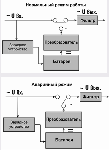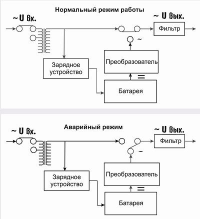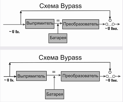 Схема линейно – интерактивного ИБП ИБП с двойным преобразованием напряжения отличается тем, что в нем поступающее на вход переменное напряжение сначала преобразуется выпрямителем в постоянное, а затем – с помощью инвертора – снова в переменное. Аккумуляторная батарея постоянно подключена к выходу выпрямителя и входу инвертора и питает его в аварийном режиме. Таким образом, достигается достаточно высокая стабильность выходного напряжения независимо от колебаний напряжения на входе. Кроме того, эффективно подавляются помехи и возмущения, которыми изобилует питающая сеть. Практически, ИБП данного класса при подключении к сети переменного тока ведут себя как линейная нагрузка. Плюсом данной конструкции можно считать нулевое время переключения на питание от аккумуляторов, минусом – снижение КПД за счет потерь при двукратном преобразовании напряжения.