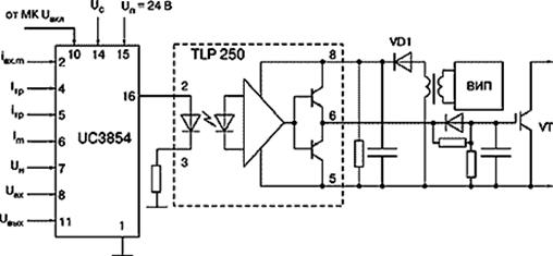 Схема управления силовым транзистором ККМ Высокочастотный ККМ в ИБП малой мощности выполнен по схеме повышающего преобразователя (бустера) с дифференциальным выходом и силовым дросселем L1, включенным во входную цепь переменного тока. Силовой транзистор ККМ VT1 (см. рис. 6) управляется сигналом с широтно–импульсной модуляцией (ШИМ). Формирование ШИМ сигнала с частотой 20 кГц осуществляет специализированная микросхема ККМ контроллера типа UC3854. На входы ККМ контроллера поступают сигналы, пропорциональные входному напряжению (uвх), входному току (iвх), напряжению на выходе ККМ (Uвых), максимальным значениям тока транзистора (Imp) и входного тока (Im), номинальному выходному напряжения ККМ (Uном) (см. рис. 8). Кроме этих сигналов, на микросхему ККМ контроллера поступает напряжение питания (Uп=24 В), сигнал синхронизации (Uс) и сигнал управления (вкл/выкл) ККМ (Uвкл) от центрального микропроцессора платы управления ИБП. Контроллер ККМ вырабатывает ШИМ–сигналы с тактовой частотой 20 кГц и различной скважностью на каждом полупериоде сетевого напряжения, что позволяет формировать входной ток необходимой формы и стабилизировать выходное напряжение. За счет изменения соотношения времени открытого состояния транзистора, когда в дросселе запасается электромагнитная энергия WL: