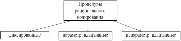 Курсовая работа: Методы рационального кодированияКурсовая работа: Методы рационального кодированияСодержание Введение Глава 1. Равномерное квантование мгновенных значений сигнала Глава 2. Неравномерное квантование мгновенных значений Глава 3. Оптимальное квантование Глава 4. Адаптивное квантование 4.1 Вводные замечания 4.2 Адаптация по входному сигналу 4.3 Адаптация по выходному сигналу Глава 5. Теория разностного кодирования Заключение Список литературы Введение Методы рационального кодирования предназначены для сокращения избыточности сообщений в условиях априорной неопределенности относительно статистических характеристик сигналов [4]. Т.е. в условиях, когда сигнал является нестационарным, что часто встречается на практике, или когда неизвестны статистические характеристики этого сигнала. Под рациональным кодированием понимают такое кодирование, при котором измерительная информация представленная в дискретной форме требует минимальное количество символов при заданной верности, т.е. отношении сигнал – шум квантования. Требование рационального кодирования сообщений обусловлены тем, обстоятельством, что в случае нерационального кодирования на первом этапе избыточность сохраняется и на последнем. В случае применения корректирующих (помехоустойчивых) кодов избыточность сообщений еще более возрастает. Процедуры рационального кодирования источника сообщений классифицируются по их возможности менять параметры или структуру кодирующего устройства для обеспечения сжатия данных. Классификация имеет вид (рисунок 1).