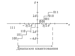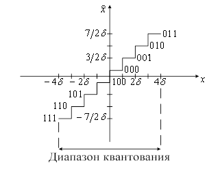 Рассмотрим характеристики равномерного квантователя в случае восьми уровневого квантования. Первый случай. Квантователь с усечением (рисунок 3) имеет одинаковое количество положительных и отрицательных уровней, но нет нулевого.