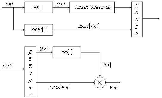 Из выражения ( 14) следует, что добавление одного разряда кодового слова улучшает отношение сигнал – шум квантования на 6 дБ. Выражение для отношения сигнал – шум квантования получено при предположении, что диапазон квантования используется полностью, если энергия сигнала изменится, то отношение сигнал – шум квантования уменьшится. В реальных условиях дисперсия телеметрического сигнала можно меняться на 20-30дБ. По этой причине для поддержания отношения сигнал – шум квантования на заданном уровне в случае равномерного квантования необходимо увеличивать число уровней квантования, при этом увеличивается избыточность сообщения. Желательно иметь устройство квантования, при котором отношение сигнал – шум квантования не зависит от уровня сигнала. Это достигается использованием неравномерного распределения уровней квантования. Глава 2. Неравномерное квантование мгновенных значений Для того чтобы относительная ошибка была постоянна при изменении дисперсии входного сигнала уровни квантования должны быть распределены по логарифмическому закону. Вместо квантования исходного сигнала можно равномерно квантовать его логарифм. В этом случае структурная схема квантователя имеет вид (рисунок 5). Докажем,