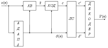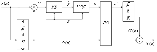 Рисунок 7 Шаг квантования должен быть известен на приемной стороне, т.е. в этом случае отсчет описывается кодовым словом и шагом квантования. Если используется квантователь с адаптацией по входу на основе усилителя с переменным коэффициентом усиления, то квантованный сигнал описывается кодовым словом и коэффициентом усиления. Структурная схема квантователя с переменным коэффициентом квантования приведена на следующем рисунке (рисунок 8).