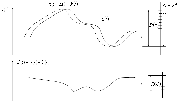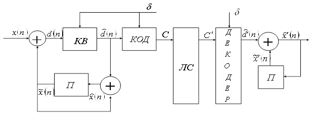 Таким образом квантованный входной сигнал отличается от исходного входного сигнала на величину шума квантования разностного сигнала. Если предсказатель (П) хороший, то дисперсия разностного сигнала будет меньше дисперсии входного сигнала и квантователь с заданным количеством уровней даст меньшую погрешность при квантовании разности, чем при квантовании исходного сигнала. Отношение сигнал – шум квантования в этом случае имеет вид: