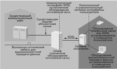 Рисунок 3 – Технология HDSL 2.3 VDSL 2.3.1 Характеристики Технология VDSL является наиболее "быстрой" технологией xDSL. Она обеспечивает скорость передачи данных "нисходящего" потока в пределах от 13 до 52 Мбит/с, а скорость передачи данных "восходящего" потока в пределах от 1,5 до 2,3 Мбит/с, причем по одной витой паре телефонных проводов. Технология VDSL может рассматриваться как экономически эффективная альтернатива прокладыванию волоконно-оптического кабеля до конечного пользователя. Однако, максимальное расстояние передачи данных для этой технологии составляет от 300 метров до 1300 метров. То есть, либо длина абонентской линии не должна превышать данного значения, либо оптико-волоконный кабель должен быть подведен поближе к пользователю (например, заведен в здание, в котором находится много потенциальных пользователей). Технология VDSL может использоваться с теми же целями, что и ADSL; кроме того, она может использоваться для передачи сигналов телевидения высокой четкости (HDTV), видео по запросу и т.п. [8] 2.3.2 Оборудование VDSL модем City-Netek CN-501 LT/RT Используя данные модемы, можно соединить две Ethernet точки на расстояниях до 1500 метров по витой паре (начиная от 3-ей категории) на скоростях до 12.5 Mbps в режиме FullDuplex. У устройства есть VDSL порт, 10/100BaseTX Ethernet порт (обычный и uplink) и POTS/ISDN splitter, к разъему которого, собственно говоря, и подключается аналоговый или ISDN телефон. Устройство имеет порт RS232, через который Вы можете конфигурировать Ваш модем и/или обновлять прошивку модема. Модемы могут быть двух видов – ведомый (RT) и ведущий (LT). Ведущий позволяет удаленно конфигурировать ведомый. Для настроек модема (через RS232 интерфейс) используется прилагаемая программа, которая позволяет модифицировать целый ряд параметров. В частности, Вы можете уменьшить скорость работы модема, но при этом поднять расстояние, на котором этот модем работает. К примеру, на 4 Mbps модем должен "пробивать" расстояние в 2.5 км.[8] VDSL коммутатор City-Netek CN-5412 VDSL коммутатор, в качестве оконечных абонентских устройств для которого используются те же самые CN-501 модемы. Данный коммутатор поддерживает VLAN, одновременную передачу VDSL и голоса, имеет на борту 12 VDSL портов и 4-е Ethernet. Имеет консольный выход для управления через терминал.[8] 2.4.3 Разработка спецификации на оборудование