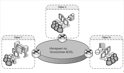 Рисунок 6 – Cisco 6200 Series Advanced DSL Access Multiplexer (DSLAM) The 605 Personal PCI ADSL Modem - внутренний модем PPP/ATM для установки в PCI-слот компьютера, позволяет пользователю принимать информацию от узла провайдера на скорости до 7Мбит/с. Cisco 626 ATM25 ADSL Modem – внешний ADSL модем. Из вышеописанных оборудований для объединения 2-х локальных сетей в одну будет использоваться ADSL модем марки Cisco 626 ATM25 ADSL и ADLS мультиплексор марки Cisco 6200 Series Advanced DSL Access Multiplexer. ADSL модем будет использован для выхода в интернет. Для обеспечения совместного доступа сети интернет необходим интернет шлюз(прокси-сервер) куда и будет подключен ADSL модем. На рисунке 7 показана примерная схема подключения отдаленных офисов в общую корпоративную сеть.