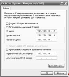 Рисунок 10 – Протокол TCP/IP Установите следующие настройки: IP-адрес:192.168.0.2 Маска подсети:255.255.255.0 DNS:192.168.0.1 Такие настройки были выбраны из-за того что они являются стандартными. Диапазон IP адресов 192.168.0.0 выделены для образовательных учреждений и корпоративных сетей, это сделано для того что бы IP адреса не совпадали в интернете. Распределение сетевых адресов. Диапазон адресов следует разбить на участки, которые будут применяться для различных целей. 1. 192.168.0.1 - 192.168.0.5 – для сервера 2. 192.168.0.6 - 192.168.0.15 – для активного оборудования, коммутатора 3. 192.168.0.20 - 192.168.0.100 – для автоматизированных рабочих мест. 5. Обеспечение безопасности ресурсов сети 5.1 Предотвращение неконтролируемого доступа к информации Предотвращение неавторизованного доступа к сетевым ресурсам означает, прежде всего, невозможность физического доступа к компонентам сети - рабочим станциям, серверам, сетевым кабелям и устройствам, и т.п. Когда сетевое соединение выходит за пределы зоны влияния, например в точке подключения к внешнему провайдеру интернета, то контроль за физическими аспектами сети теряется. Оборудование в помещении компании должно находиться под пристальным наблюдением. Серверы, на которых хранятся важные или уязвимые данные, не должны стоять открыто на столе или в незапертой комнате, куда может зайти кто угодно. Аналогичным образом должны защищаться маршрутизаторы, концентраторы, коммутаторы и другие устройства. Комнаты с компьютерами должны закрываться на замок или находиться под круглосуточным наблюдением. Если кто-то из сотрудников компании работает круглосуточно, то это комнату закрывать не обязательно - но только в том случае, если персонал не дежурит по одному. В идеале доступ в подобные помещения должен контролироваться, например, путем регистрации в журнале. Резервные носители, такие как ленты или перезаписываемые компакт-диски, должны быть защищены так же, как и исходные данные. Недопустимо хранить резервные копии на сервере или рабочей станции, оставлять картриджи и CD на столе или в незапертом ящике. [13] 5.2 Firewall Firewall - это программа, представляющая собой защитный барьер между компьютером и внешним миром. Хакеры используют специальное программное обеспечение для сканирования интернета и поиска незащищенных компьютеров. Такие программы посылают маленький пакет данных компьютеру. Если на компьютере нет Firewall, то он автоматически отвечает на принятое сообщение, и это означает для хакера, что система открыта и может быть взломана. Firewall распознает такие случаи и не отвечает на подобные сообщения. Таким образом, хакеры даже не могут узнать, что компьютер подключен к сети. Внутри локальной сети, которую от внешних угроз защищает корпоративный Firewall, рабочая станция остается беззащитной. Настройки общего Firewall, не позволяют разрешить или запретить активность тех или иных приложений, которые запущены на рабочей станции, а так же предотвратить распространение вирусов. При помощи специальных типов атак злоумышленник может в локальной сети получить любые данные, которые передаются по сети с Вашего компьютера. Переговоры по ICQ, почтовые пароли, письма и любая другая конфиденциальная информация может быть перехвачена до того, как она дойдет до получателя. Даже в случае если используются защищенные соединения (SSL), все равно есть известные способы п