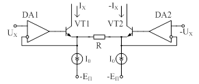 Рис. 3. Упрощённая схема ПНТ с операционными усилителями В этой схемотехнической конфигурации повышение линейности достигается за счёт того, что разность напряжений между входами операционного усилителя имеет достаточно малое значение, которое практически не меняется, значение дифференциального сопротивления эмиттера делится в петлевое усиление раз, что можно описать выражением: