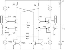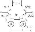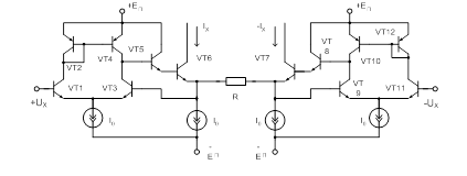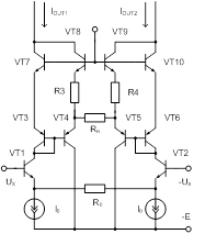 Рис. 5. ПНТ с линеаризацией влияния дифференциального сопротивления эмиттеров транзисторов дифференциального каскада Оценку нелинейности преобразования напряжения в ток для схемы рисунка 5 можно произвести следующим образом. Рассмотрим следующие уравнения:
