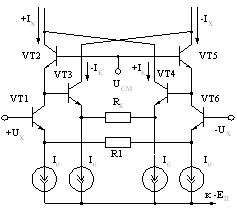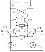 Рис. 4. Схема ПНТ с линеаризацией крутизны преобразования за счёт ООС В связи с вышеизложенным схему ПНТ (рис. 4) целесообразно использовать только при интегральном исполнении. Кроме того, следует помнить, что частотные свойства такого преобразователя будут не очень хорошими по сравнению с ПНТ на одиночном дифференциальном каскаде. Другой способ устранения нелинейности преобразования демонстрируется схемой ПНТ, представленной на рисунке 5. Этот способ компенсации нелинейности получил достаточно широкое распространение [19, 20]. Суть его заключается в следующем: тем или иным способом формируется компенсирующий ток, ослабляющий влияние изменения rE дифференциального каскада при изменении тока эмиттера. Работает схема ПНИ (рис. 5) следующим образом. Транзисторы VT1 и VT6, образующие дифференциальный каскад, с помощью резистора R1 осуществляют преобразование входного напряжения в выходной ток. Транзисторы VT2 и VT5 включены по схеме с общей базой и передают токи коллекторов транзисторов VT1 и VT6 на выход с коэффициентом передачи α » 1. Одновременно с этим при изменении токов эмиттеров транзисторов VT2 и VT5 меняются и их напряжения база-эмиттер. В этом случае меняется и разность напряжений база-эмиттер транзисторов VT2 и VT5, причём в зависимости от знака приращения входного напряжения UX разность напряжений база-эмиттер транзисторов VT2 и VT5 также меняет знак. Вспомогательный дифференциальный каскад на транзисторах VT3 и VT4 с помощью резистора RK преобразует напряжение, пропорциональное разности баз-эмиттер транзисторов VT2 и VT5, в ток, который перекрёстным образом отправляется на токовые выходы ПНТ. Поскольку в базовой схеме ПНТ на транзисторах VT1 и VT6 присутствует составляющая, обусловленная DUБЭ1,6 этих транзисторов, то при условии, что транзисторы VT2 и VT5 в точности идентичны транзисторам VT1 и VT6, а токи источников опорного тока одинаковы, выбором сопротивления резистора RK можно скомпенсировать влияние DUБЭ1,6.