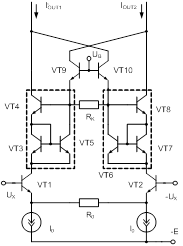 Рис. 9. Схема ПНТ, формирующая компенсирующие токи в эмиттерных цепях дифференциального каскада Фактически вся компенсирующая цепь обеспечивает неизменность тока эмиттера транзисторов дифференциальной пары при изменении входного напряжения. Действительно, если входное напряжение UX растёт, растёт и эмиттерный ток транзистора VT1 за счёт приращения тока через резистор R0. Одновременно с этим растёт напряжение и на базе транзистора VT10 (на базе транзистора VT7 напряжение соответственно уменьшается), что приводит к уменьшению тока эмиттера транзистора VT7 за счёт появления приращения тока через резистор RK и к снижению тока эмиттера транзистора VT1. Таким образом, ток эмиттера транзистора VT1, наряду с положительным приращением тока через резистор R0, получает отрицательное приращение тока через коллектор транзистора VT7, и при правильном выборе резистора RK ток эмиттера транзистора VT1 перестаёт зависеть от входного напряжения. Естественно, ток эмиттера транзистора VT2 зависит от входного сигнала «с точностью до наоборот», в результате чего влияние режимно зависимых дифференциальных сопротивлений эмиттеров транзисторов VT1 и VT2 исключается. Условие максимальной линейности можно получить из выражения для разности выходных токов ПНТ:
