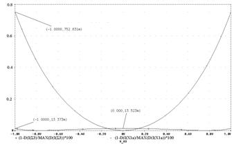 второе слагаемое в выражении (15) обращается в нуль, поэтому результирующая крутизна преобразования напряжения в ток не будет зависеть от уровня входного сигнала. Так как выражение (15) было получено при определённых допущениях (например, a всех транзисторов не зависят от тока и равны единице), выполнение условия (14) не исключает полную независимость крутизны от уровня входного напряжения. Однако погрешность преобразования можно сделать достаточно малой, что подтверждается результатами моделирования рассмотренных схем (рис. 6). Графики, приведённые на рисунке 6, по сути, представляют собой отклонение в процентах нормированной крутизны прямой передачи от единицы, что при U0 = 1 совпадает с выражением (8). Для схемы рисунка 2а максимальное отклонение составляет 0,75 %, а для схемы ПНТ рисунка 5 – не превышает 0,015 %.