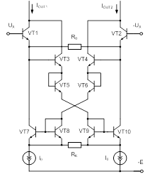 то есть влияние нелинейной составляющей ослабляется в петлевое усиление раз. С точки зрения линейности, такая схема обладает наилучшей линейностью преобразования напряжения в ток (при достаточно большом коэффициенте усиления операционного усилителя), практически не требует настройки, однако достаточно сложна и обладает полосой пропускания, определяемой операционным усилителем. На рисунке 4 приведён достаточно простой вариант реализации такой схемы при интегральном исполнении, однако, как видно из рисунка, он весьма громоздок, причём на рисунке отсутствуют реальные источники тока.