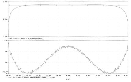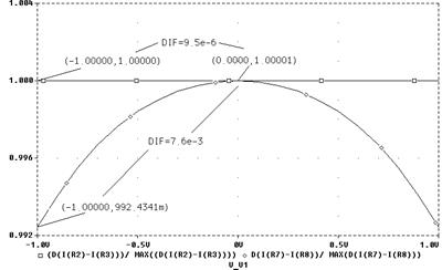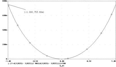 Рис. 13. Схема ПНТ, предназначенная для моделирования В режиме .DC задайте вариацию источника V1 в пределах ±1 В. После выполнения моделирования через меню Trace\Add Trace наберите в командной строке (1-d(I(R23)- I(R22))/ MAX(d(I(R23)- I(R22))))*100. Смысл этого выражения в следующем: находятся разность выходных токов, протекающих через резисторы R22 и R23; производная от этой разности, которая нормируется по отношению к максимальному значению производной; отклонение нормированной производной от максимального значения (1) и умножается на 100 %. Такой способ оценки линейности полностью соответствует выражению (5а), полученному аналитическим путём. Должен получиться график, подобный тому, что представлен на рисунке 14. Отметим, что максимальное отклонение от линейности у вас может получиться иным (несколько больше или меньше) в зависимости от используемых моделей транзисторов, но характер графика будет подобен приведённому на рисунке 14.
