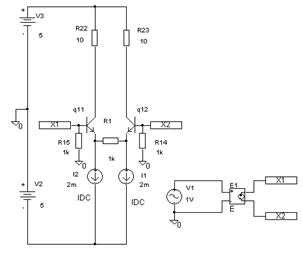 Рис. 12. Графики, иллюстрирующие отклонение от линейности мостового и базового ПНТ на основе дифференциального каскада Моделирование проведено в сравнении с базовой схемой на основе дифференциального каскада при одинаковой крутизне преобразования и близких статических токах выходных транзисторов той и другой схемы. Погрешность крутизны преобразования для базовой схемы достигает 20 %, а для схемы мостового преобразователя – менее 0,01 % (нижний график рис. 12). 4. Исследование ПНТ «Соберите» упрощённую схему ПНТ, приведённую на рисунке 2а. Упрощение этой схемы обусловлено применением идеальных источников тока, что существенно не повлияет на изучение принципа её работы. Обратите внимание: в схему ПНТ в коллекторные цепи необходимо включить одинаковые резисторы сопротивлением 1…10 Ом. Вторые выводы этих резисторов подключаются к положительной шине питания. Резисторы будут выполнять роль датчиков тока и на работу схемы, с точки зрения оценки её линейности, не повлияют. Параметрический синтез схемы можно провести, воспользовавшись следующими соображениями. Выбрав напряжение питания ±5 В, для удобства оценки крутизны преобразования резистор R1 можно выбрать 1 кОм. Тогда при условии, что изменение входного напряжения будет составлять ±1 В, ток источников опорного тока целесообразно выбрать 2 мА. В этом случае коэффициент использования тока Х » 0,5. В качестве моделей компонентов можно выбрать модели любых интегральных транзисторов, имеющихся в библиотеке моделирующей программы и способных работать при напряжении коллектор-база более 10 В. Можно рекомендовать следующий порядок изучения и моделирования схемы. 1. Подключите вспомогательные резисторы сопротивлением в несколько килоом между входами ПНТ и общей шиной. Эти резисторы необходимы для создания пути протекания базовых токов транзисторов дифференциальной пары. Функциональный элемент Е1 представляет собой источник напряжения, управляемый напряжением (ИНУН). (Его параметр GANE оставьте по умолчанию равным единице.) Он необходим для того, чтобы создать дифференциальное напряжение между входами ПНТ. В результате у Вас должна получиться схема, представленная на рисунке 13.
