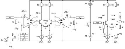 Рис. 14. График, иллюстрирующий отклонение от линейности ПНТ рисунка 2а 2. «Соберите» схему ПНТ на основе операционных усилителей (рис. 4). Для сопоставительного моделирования с базовой схемой ПНТ на основе дифференциального каскада в этом же файле представьте схему ПНТ рисунка 2а. У вас должна получиться схема, приведённая на рисунке 15. Поскольку операционные усилители допускают питание от ±15 В, входное напряжение для такой схемы может достигать и ±10 В, если сопротивление резистора R1 и токи источников токов выбраны соответственно. Естественно, если сопротивление резистора R1 выбрать 10 кОм, линейность ПНТ с ОУ будет ещё выше.