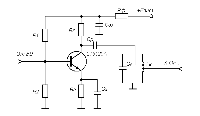 Расчет усилителя радиочастоты Входная цепь не обеспечивает должной избирательности по зеркальному каналу, поэтому следует применить УРЧ с резонансной нагрузкой, которой может служить контур, аналогичный контуру входной цепи. Помимо требуемой избирательности усилитель радиочастоты должен обладать также достаточно высоким усилением по мощности, а также малым коэффициентом шума. Исходя из этих условий, выберу в качестве усилителя РЧ схему с ОЭ на СВЧ n-p-n биполярном транзисторе 2Т3120А. Схема каскада приведена на рис.4.
