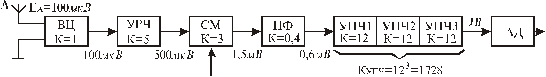 Рис.4. Структурная схема ПРМ по усилению Таким образом, структурная схема ПРМ по усилению имеет вид, приведённый на рис.4. 2.3 Проверка возможности осуществления регулировокАРУ обеспечивает требуемое относительное постоянство выходного напряжения ПРМ в условиях изменения мощности принимаемых сигналов. АРУ современных ПРМ осуществляются путём: а) изменения крутизны характеристики электронных приборов; б) регулировки междукаскадных связей (обычно в транзисторных ПРМ); в) регулируемых обратных связей в каскадах или группе каскадов. Существует большое разнообразие схем АРУ, применяемых в современных ПРМ. Подавляюще большинство из них относятся к классу инерционных систем АРУ с обратной связью.Проверим возможность