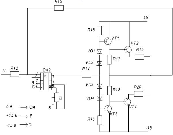 Резистор R14 защищает ОУ от короткого замыкания на выходе: R14=0.78 кОм. Резисторы R19 и R20 введены для защиты выходного каскада от короткого замыкания выходных зажимов. Их следует выбирать из следующих условий: при RH=0 VT2, VT4: Iк2< Iк1max, VT1, VT3: Iк2< Iк2max, где Iк2max=2 А; Iк2max=0,8 А; Uпит=15 В.