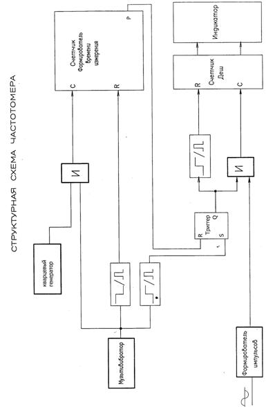 Значение погрешности равно 0,00024%, что меньше заданного в ТЗ 2%. Проектирование частотомера Необходимо разработать частотомер, измеряющий частоту выходного напряжения генератора в диапазоне от 30 Гц до 500 Гц с погрешностью 10 Гц и временем индикации 1 с, построенного на элементах имеющих ТТЛ структуру. В качестве частотомера будет использоваться электронно-счётный частотомер, работа которого основана на подсчёте числа импульсов измеряемого сигнала в течение заданного интервала. Описание принципа работы и компонентов электронно-счётного частотомера. Исходя из предложенной структурной схемы данный частотомер разбит на следующие блоки: 1) Мультивибратор. 2) Формирователь. 3) Генератор с кварцевым резонатором. 4) Формирователь времени измерения. 5) Логического элемента И. 6) Преобразователи фронта и среза в импульс. 7) СД элемент. 8) Светодиодный индикатор. 9) Т-RS-триггер. Мультивибратор собран на микросхеме К1006ВИ1 (DD1), служит для генерации задающих прямоугольных импульсов. Для повышения точности, корректировки работы мультивибратора и генератора в схему включен формирователь времени измерения. Он позволяет получить чёткие задающие импульсы с длительностью логической единицы 1 с и длительностью логического нуля 1 с. Формирователь времени измерения реализован на 5-ти счётчиках делителях на 8 530ИЕ14 (DD10, DD11, DD12, DD13, DD14). Генератор с кварцевым резонатором предназначен для получения по настоящему стабильных колебаний на высокой частоте. В нем используется кусочек кварца (искусственного – двуокись углерода), вырезанный и отшлифованный таким образом, что он имеет определенную частоту колебаний (32768 Гц). Высокая добротность Q(10000) и хорошая стабильность делают естественным его применение как задающего элемента в генераторах и фильтрах с улучшенными параметрами. В данном частотомере, генератор выполнен на основе микросхемы 530ЛА3. T-RS-триггер – 530ТМ2. Триггеры широко используются во многих узлах электронной аппаратуры в виде самостоятельных изделий и в качестве базовых элементов для построения других более сложных устройств (счётчиков, регистров, запоминающих устройств). Они представляют собой простейшие последовательные устройства, общим свойством которых является способность длительно оставаться в одном из двух возможных состояний, который распознаются по значению их входных сигналов. В простейшем случае триггер представляет собой симметричную структуру из двух логических элементов ИЛИ-НЕ или И-НЕ, охваченных перекрестной положительной обратной связью. Формирователь служит для преобразования входных сигналов, имеющих синусоидальную форму, в прямоугольные импульсы, которые затем считываются счётчиком-дешифратором элементом 133ПП4, в течении первой 1 с происходит подсчёт количества импульсов, а в течении следующей 1 с – вывод на индикаторы АЛС333Б (HG1 – HG4) результата подсчёта. Формирователь основан на операционном усилителе К140УД26А (DA1), в обратную связь которого установлены диод и стабилитрон. Диод служит для отсечения отрицательной составляющей входного сигнала, а стабилитрон ограничивает положительную составляющую. Таким образом, на выходе операционного усилителя сигнал представляет собой практически прямоугольные импульсы. В техническом задании указана погрешность дискретности равная 10 Гц, поэтому к микросхеме СД нужно под