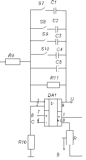 ёмкость конденсатора С5. Из формулы для данного фильтра: Перестройка фильтра на другие частоты среза обеспечивается включение шунтирующих конденсаторов. Схема состоит из пяти пределов измерения. На пределе измерения 1 подключается емкость С5, на пределе измерения 2 подключается С4, емкость которого примерно в а раз меньше С5. Аналогично рассчитываются остальные емкости. Частота среза данного фильтра определяется выражением fСР=1/(2pR11C5). Расчёт производим по следующей формуле: