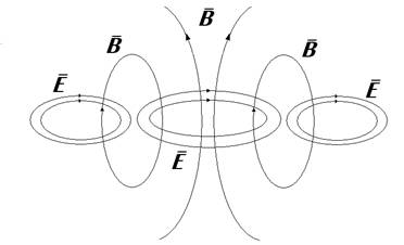 Рисунок 1 – Схема радіохвилі Процес взаємного породження магнітного й електричного поля повинен безупинно тривати й захоплювати усі нові й нові області в навколишньому просторі. Процес взаємного опородження електричних і магнітних полів відбувається у взаємно перпендикулярних площинах. Електричні й магнітні поля можуть існувати в речовині й у вакуумі, і можуть поширюватися у вакуумі. Умовою виникнення електромагнітних хвиль є прискорений рух електричних зарядів. Так, зміна магнітного поля відбувається при зміні струму в провіднику, а зміна струму відбувається при зміні швидкості зарядів. Отже, електромагнітні хвилі повинні виникати при прискореному русі електромагнітних зарядів.
