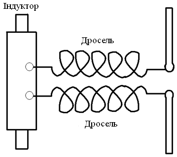 Але от створення електромагнітних хвиль дослідним шляхом належить фізикові Герцу. Для цього Герців використовував високочастотний іскровий розрядник (Вібратор). Рисунок 2 – Схема найпростішого іскрового розрядника Зробив цей досвід Герців в 1888 г. Полягав вібратор із двох стрижнів, розділених іскровим проміжком. Експериментував Герців із хвилями частотою 100000000 Гц. Обчисливши власну частоту електромагнітних коливань вібратора, Герц зміг визначити швидкість електромагнітної хвилі по формулі υ=λν.Вона виявилася приблизно дорівнює швидкості світла: з=300000 км/с. Досвід Герца блискуче підтвердили пророкування Максвелла. Для порушення коливань вібратор підключався до індуктора. Коли напруга на іскровому проміжку досягало пробивного значення, виникла іскра, яка закорочувала обидві половинки вібратора. У результаті виникали вільні загасаючі коливання, які тривали доти, поки іскра не гаснула. А для того щоб виникаючий при коливаннях високочастотний струм не відгалужувався в обмотки індуктора, між вібратором і індуктором включалися дроселі (котушки з великою індуктивністю). Після загасання іскри вібратор знову заряджався від індуктора, і весь процес повторювався знову. Таким чином, вібратор Герца збуджував ряд цугів слабко загасаючих хвиль.