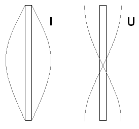 І під час цих коливань встановлювалася стояча хвиля струму й напруги. Сила струму I була максимальною (пучність) у середині вібратора й зверталася в нуль на його кінцях. Напруга U у середині вібратора мала вузол, на кінцях – пучності. Досвіди Герца були продовжені П.Н. Лебедєвим в 1894 г. П.Н. Лебедєв відкрив подвійне переломлення хвиль у кристалі. Також радіохвилі мають усі основні властивості хвиль. Рисунок 3 – Зображення стоячих хвиль струму і напруги Електромагнітні