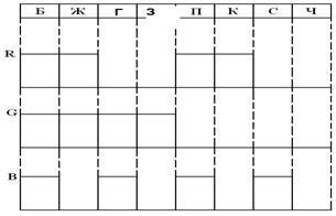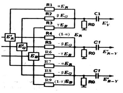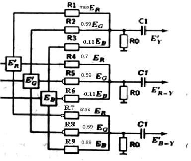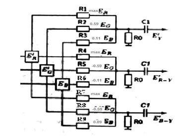Рисунок 1. Формирование сигналов различных цветов При воспроизведении пурпурного цвета (рисунок 1): ER=1; EG=0; EB=1 ЕR-Y = ER – EY = E3-0.3ЕR-0.59ЕG-0.11ЕB ER-Y=0.7ER -0.59EG -0.11EB E(n)=0.7-0.11=0.59 (амплитуда пурпурного цвета) При воспроизведении голубого цвета (рисунок 1): ER=0; EG=1; EB=1 ER-Y =0.7·ЕR-0.59·ЕG-0.11·ЕB E(n)=-0.59-0.11=-0.7 (амплитуда голубого цвета) Формула для расчета аналогового сигнала цветности: EB-Y= EB-EY= EB-0.3·ЕR-0.59·ЕG-0.11·ЕB EB-Y= -0.3·ЕR-0.59·ЕG+0.89·ЕB E(n) = 0.89-0.3=0.59(амплитуда пурпурного цвета) Е(n) = 0.89-0.59=0.3(амплитуда голубого цвета) 1.2 Матрица на девяти сопротивлениях для формирования Ey и ER-Y; EB-Y сигналов, расчет коэффициентов матрицирования.