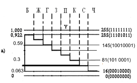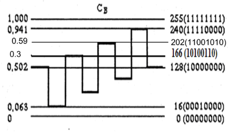 Рисунок 4. Структурная схема кодирующей матрицы при воспроизведении голубого цвета Рекомендация ITU 601: n – количество разрядов квантования; разрядов квантования n = 8, что дает уровней квантования NКВ = 28; Уровень черного Ey - 16-й уровень квантования; Уровень белого - 235-й уровень квантования; Уровней квантования - 16 снизу и 20 сверху; Резервные зоны на случай выхода значений аналогового сигнала яркости за пределы номинального диапазона на 0-м и 255-м уровнях квантования - сигналы синхронизации. АЦП сигнала яркости: Y=219·Е'Y+16, (3) где Е'Y — аналоговый сигнал яркости, меняющийся 0... 1В Y- цифровой сигнал яркости, меняющийся от 16 до 235. При воспроизведении пурпурного цвета Е'Y = 0.59 В, т. е.: Y=219·Е'Y+16=219·0.59+16=145.21=1001 0001 При воспроизведении голубого цвета Е'Y = 0.3 В, т. е.: Y=219·Е'Y+16=219·0.3+16=81=1010001 У цветоразностных сигналов резервные зоны по 16 уровней квантования сверху и снизу. На АЦП поступает компрессированный цветоразностный сигнал, формируемый: E'CB=0.564·E'B-Y, (4) где E'CB изменяется от -0.5 до 0.5 В. АЦП цветоразностного сигнала: CB=224·E'CB+128=126.336·E'B-Y+128=126·E'B-Y+128, (5) где 128-й уровень квантования соответствует нулевому значению цветоразностного сигнала. При воспроизведении пурпурного цвета E'B-Y = 0.59, т. е.: CB=126·E'B-Y+128=202=11001010 При воспроизведении голубого цвета E'B-Y =0.3, т. е.: CB=126·E'B-Y+128=165.8=10100101 3. Графики изменения сигналов яркости и цветности во времени в строчном периоде для текстового изображения «градационный клин»