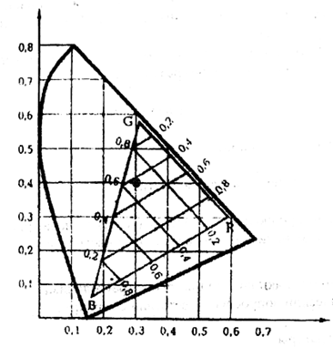 Рисунок 6. - Цветовой треугольник внутри локуса. R=0.4 G=0.41 B=0.5 5. Ответ на теоретический вопрос Область применения построчного, черезстрочного и с кратностью деления на «3» принципа формирования растра цветность яркость аналоговый сигнал растр В настоящем разделе анализируются основные законы развертки изображения, принципы формирования построчного и чересстрочного растров, особенности построения синхрогенератора. Получение чересстрочного растра В телевидении используется линейная развертка, т. е. развертка с постоянной скоростью вдоль строк и по кадру. При перемещении луча по горизонтали прочерчиваются строки растра, а перемещением луча по вертикали из совокупности строк образуется растр. При построении построчного растра за время развертки по вертикали (TK) прочерчивается z строк. Частоты кадрового и строчного отклонений при построчном способе разложения оказываются связанными друг с другом следующим соотношением: fz = z · fK, (2.1) где fz – частота строчной развертки; fK – частота кадровой развертки. Как известно, максимальная частота ТВ сигнала определяется соотношением fmax = kz2 fK /2, где k = 4/3 – формат кадра, а z = 625 – число строк. С целью сокращения fmax частоту кадровой развертки выбирают минимально возможной, и определяется она минимально необходимым числом фаз в передаче движущегося изображения, при котором движение воспринимается непрерывным. Экспериментально установлено, что для этого частота смены кадров должна быть не менее 16–20 Гц. Именно поэтому для большинства существующих стандартов вещательного телевидения fK= 25 Гц. Однако при таком значении кадровой частоты оказывается сильно заметным мелькание яркости экрана, поскольку критическая частота мелькания для средней яркости телевизионного изображения равна 48–50 Гц. Эффективным способом увеличения частоты мелькания телевизионного изображения при сохранении неизменной кадровой частоты является применение чересстрочного растра. Кадр чересстрочного растра образуется из совокупности двух полукадров (полей). В первом полукадре развертываются все нечетные строки растра: 1, 3, 5 и т. д., а во втором – четные: 2, 4, 6 и т. д. За период кадра, таким образом, изображение сменится дважды. С этой целью частоту развертки по вертикали увеличивают по сравнению с частотой смены кадров в 2 раза: fn = 2 fK где fn - частота развертки по вертикали, т. е. частота полей (полукадров). При формировании чересстрочного растра основным требованием является размещение строк одного полукадра строго между строками другого. Наиболее просто эта задача решается при нечетном числе строк в растре : z =2k+1, где k = 1, 2, 3, 4... . В этом случае в одном полукадре изображения оказываются развернутыми k строк и еще половина строки (рис. 2.1), а так как при развертке одной строки электронный луч успевает переместиться по вертикали на толщину двух строк, строки второго полукадра, начинающиеся с прочерчивания второй половины последней строки первого полукадра, попадут в середины промежутков между строками этого полукадра. Таким образом, при нечетном числе строк в растре и удвоенной частоте вертикального отклонения по сравнению с построчной разверткой чересстрочный растр формируется автоматически. Следует иметь в виду, что качество чересстрочного растра, определяемого расположением строк одного поля строго посередине в пр