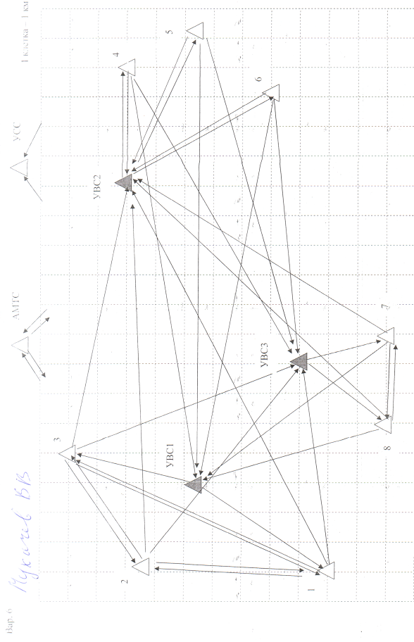 Курсовая работа: Расчет межстанционной сети связи районированной ГТС с УВСКурсовая работа: Расчет межстанционной сети связи районированной ГТС с УВСМинобрнауки России Федеральное агентство по образованию Государственное образовательное учреждение высшего профессионального образования «Ижевский государственный технический университет» Кафедра «Сети связи и телекоммуникационные системы» Курсовая работа по дисциплине «Теория телетрафика» на тему: «Расчет межстанционной сети связи районированной ГТС с УВС» Вариант 6 Выполнил студент группы 8-77-3: Мухачев В.В. Принял: Абилов А.В. Ижевск, 2011 Содержание 1. Задание и исходные данные 2. Расчет интенсивности поступающей нагрузки для каждой АТС 3. Расчет интенсивности нагрузки на выходе каждой АТС 4. Определение внутристанционной нагрузки 5. Определение интенсивности нагрузки на УСС и АМТС 6. Расчет интенсивности нагрузки, распределяемой по направлениям других АТС 7. Распределение интенсивности нагрузки на направлениях межстанционной связи различными методами 7.1 Пропорционально исходящим интенсивностям нагрузок станций 7.2 Пропорционально ёмкости станций 7.3 Пропорционально условным исходящим интенсивностям нагрузок станций 8. Структурные матрицы распределения нагрузок 8.1 Пропорционально исходящим нагрузкам 8.2 Пропорционально ёмкости станций 8.3 Пропорционально коэффициентам тяготения 9. Структурные матрицы расчетных нагрузок 9.1 Пропорционально исходящим нагрузкам 9.2 Пропорционально ёмкости станций 9.3 Пропорционально коэффициентам тяготения 10. Матрицы соединительных линий 10.1 Пропорционально исходящим нагрузкам 10.2 Пропорционально ёмкости станций 10.3 Пропорционально коэффициентам тяготения 11. Структурные матрицы потоков 11.1 Пропорционально исходящим нагрузкам 11.2 Пропорционально ёмкости станций 11.3 Пропорционально коэффициентам тяготения 12. Расчет числа соединительных линий и цифровых трактов между площадками 13. Проектирование ГТС с УВС с использованием программы "NET 5(6)" 13.1 Матрица нагрузок (каждая с каждой) 13.2 Структурная матрица нагрузок 13.3 Матрица соединительных линий 13.4 Структурная матрица 30-канальных трактов Вывод Список литературы 1. Задание и исходные данные Задание 1. Для каждой АТС заданной сети рассчитать поступающую от абонентов телефонные нагрузки, пересчитать нагрузки на выходы каждой АТС. 2. Распределить общую выходящую нагрузку каждой АТС по следующим направлениям: на АМТС, на УСС, на внутристанционном направлении. 3. Оставшуюся нагрузку (исходящую) распределить по направлениям других АТС тремя методами: пропорционально емкости АТС, пропорционально исходящим нагрузкам АТС, пропорционально условным исходящим нагрузкам АТС (с учетом расстояний между АТС). Составить соответствующие матрицы (таблицы) нагрузок для полносвязной схемы. 4. Для каждого из трех методов распределения нагрузки составить структурные матрицы (таблицы) нагрузок согласно заданной схемы соединения АТС в сети. Составить соответствующие матрицы (таблицы) расчетных нагрузок. 5. По табл. Эрлангов определить количество СЛ на всех направлениях межстанционной связи и составить соответствующие матрицы (таблицы) соединительных линий. 6. Составить матрицы (таблицы) первичных цифровых трактов (ПЦТ) между площадками. 7. Сравнить результаты, полученные для разных трех методов распределе