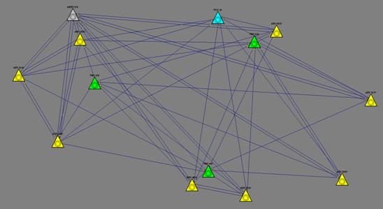 13. Проектирование ГТС с УВС с использованием программы “NET – 5(6)” Программа “Net 5(6)” позволяет рассчитать нагрузку, число соединительных линий, число первичных цифровых трактов на направлениях межстанционной связи аналого-цифровых ГТС с 5-ти и 6-тизначной нумерацией, выводит диаграммы распределения нагрузок. Результаты расчетов программа выводит в таблицы приложения Microsoft Excel, что делает удобным обработку значений и дальнейшие расчеты. На рисунке показана схема расположения объектов и направлений межстанционной связи. Методика расчета программы следующая: Расчет поступающей на АТС нагрузки производится по параметрам нагрузки по ВНТП; Нагрузка к АМТС рассчитывается по удельной нагрузке по ВНТП, а нагрузка от АМТС – по соотношению (Yвх. м / Yвых. м); Расчет внутристанционной нагрузки производится по ВНТП; Расчет числа соединительных линий – по расчетной нагрузке.