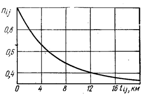 Согласно графику, найдём коэффициенты тяготения, соответствующие найденным расстояниям между АТС (таблица 7.4): Таблица 7.4 Коэффициенты тяготения